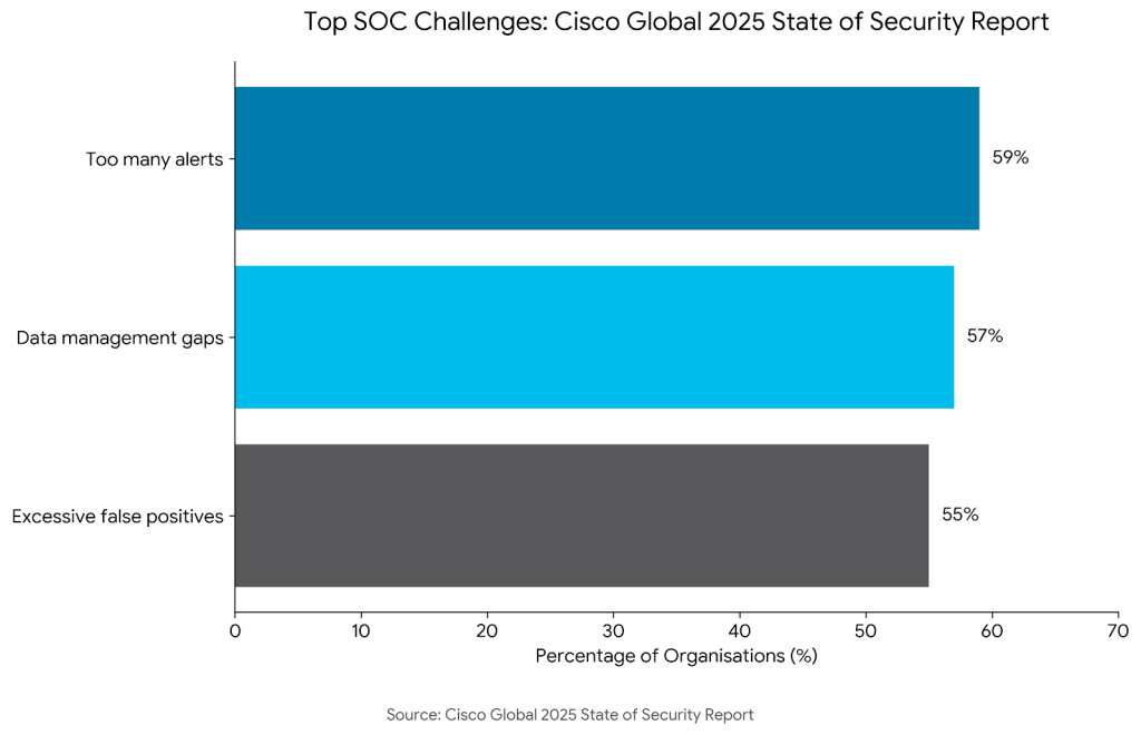 In the Cisco Global 2025 State of Security Report Cisco3 highlights serious SOC challenges, reporting that 57% of organisations say they lose valuable investigation time due to data management gaps, 59% have too many alerts, and 55% struggle with excessive false positives in their workflows. Without predictive prioritization, the SIEM effectively becomes a “data graveyard” rather than a tool for defense.