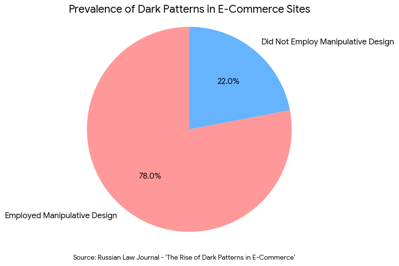 Recent scholarship underscores just how pervasive these tactics have become. In a significant study titled “The Rise of Dark Patterns in E-Commerce,”1 published in the Russian Law Journal, researchers found that approximately 78% of e-commerce sites investigated employed at least one form of manipulative design, such as hidden charges or forced continuity.