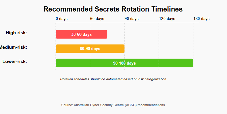 Regular rotation of secrets limits the damage potential of compromised credentials. The ACSC recommends automated rotation cycles based on risk categorization: