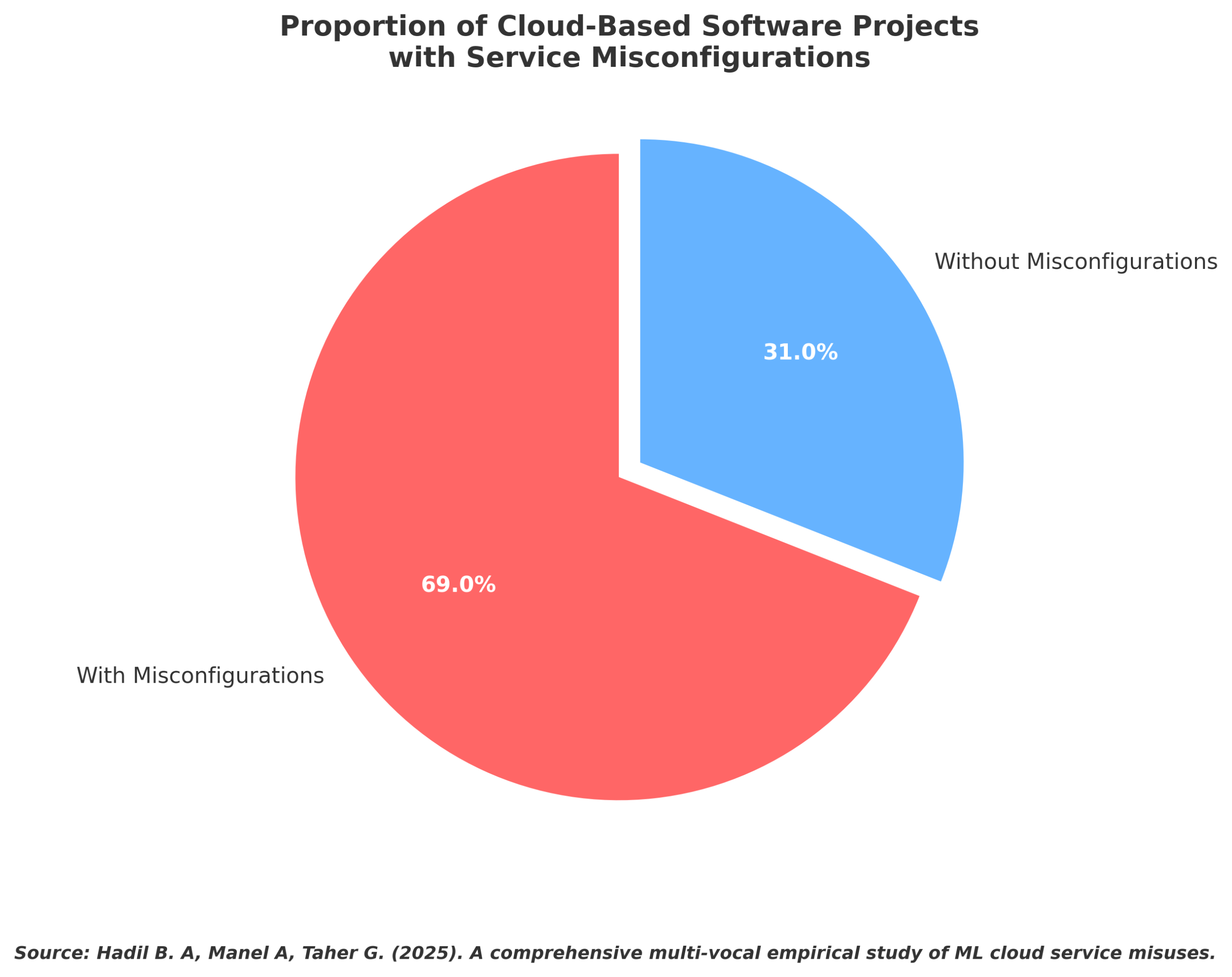 This is not a theoretical risk. A research Comprehensive Multi-Vocal Empirical Study of ML Cloud Service Misuses4 identifies that 69% of examined cloud-based software projects contained service misconfigurations (misuses) that left them vulnerable or inefficient.