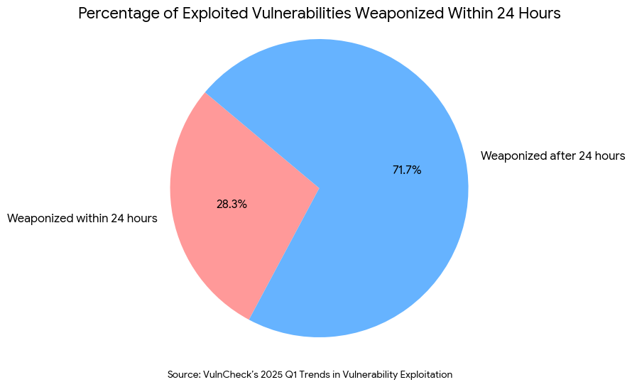 However, the ones they do use, they use fast. Data from VulnCheck’s 2025 Q1 Trends in Vulnerability Exploitation3 reveals that 28.3% of exploited vulnerabilities are weaponized within 24 hours of disclosure.