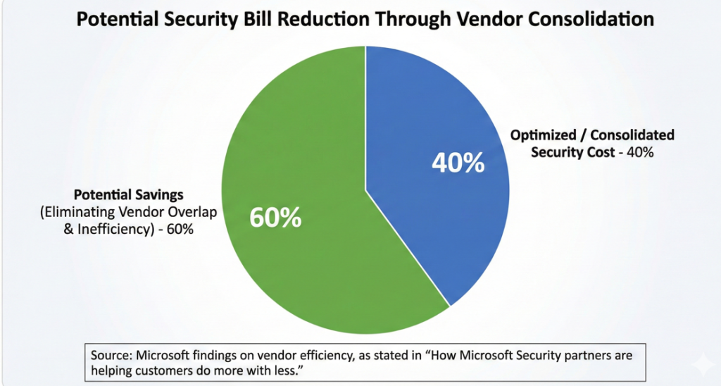 The market is waking up to this inefficiency. This trend is best summarized by Microsoft’s findings on vendor efficiency, as stated in its How Microsoft Security partners are helping customers do more with less.2 Their data reveals that the average customer can cut their security bill by 60% simply by eliminating the overlap inherent in a multi-vendor environment. For the modern CFO and CISO, this turns security consolidation into a clear financial correction: it allows the organization to retire expensive legacy point solutions and redirect those funds toward actual threat defense rather than vendor management. By consolidating vendors, organizations can reduce the “management overhead” of security, the time analysts spend switching between dashboards, and redirect those resources toward proactive threat hunting.